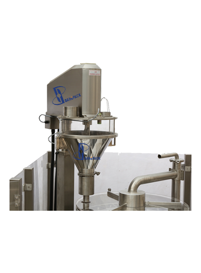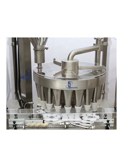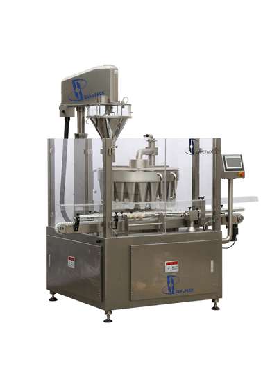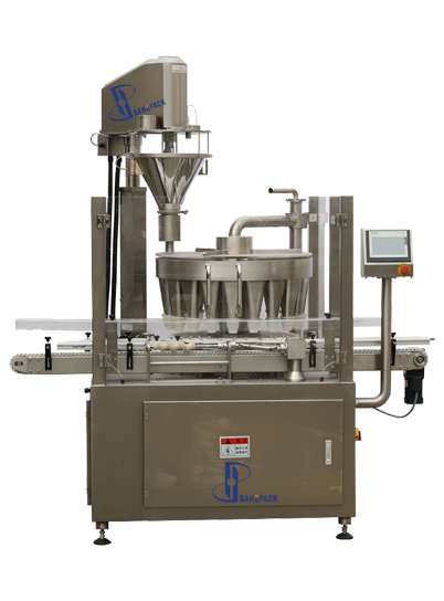 旋轉(zhuǎn)式充填機(jī)具有很高的生產(chǎn)效率和生產(chǎn)速度,即使在非??量痰纳a(chǎn)要求下,旋轉(zhuǎn)式充填系統(tǒng)將物料連續(xù)的分發(fā)到旋轉(zhuǎn)的多工位漏斗里,瓶子在漏斗下,一個瓶子對應(yīng)一個漏斗,不等距螺旋和星形轉(zhuǎn)盤將瓶子均勻的對應(yīng)到每一個漏斗下同步旋轉(zhuǎn)并振動,螺桿計量機(jī)精確的將物料充填到漏斗里,然后物料在星形轉(zhuǎn)盤旋轉(zhuǎn)四分之三圈的時間內(nèi)從漏斗落到瓶子里,特別適用于瓶子口徑小,但包裝速度要求高的各種粉末和小顆粒物料。