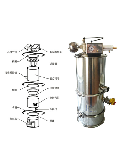 氣動(dòng)式真空上料機(jī)是利用壓縮空氣通過(guò)真空發(fā)生器產(chǎn)生高真空實(shí)現(xiàn)對(duì)物料的輸送,不需要機(jī)械式真空泵,具有結(jié)構(gòu)簡(jiǎn)單、體積小、免維修、噪音低、控制方便、消除物料靜電和符合GMP要求等優(yōu)點(diǎn)